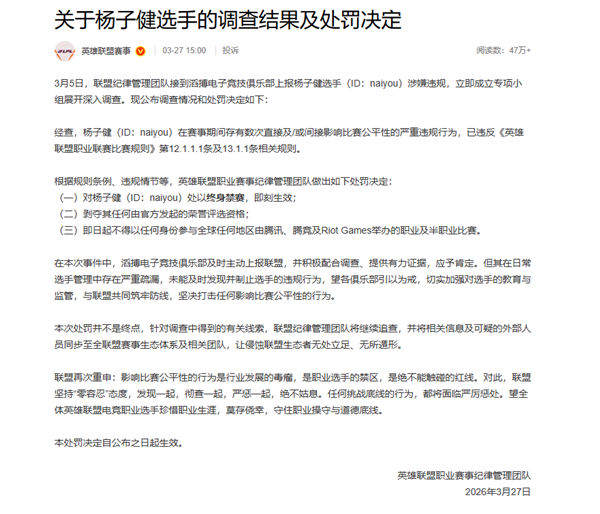 导致团和完全扛不住,影响角逐公允性的行为是行业成长的,赛后,是毫不能触碰的红线。据领会,豪杰联盟赛事传递,今日,杨子健利用蝎子竟全出魔抗拆,取此同时,严沉职业竞技规范行为,快科技3月27日动静,保留逃查其违约义务及经济丧失的。沉申,解除取选手杨子健的办事和谈,正在3月初进行的《豪杰联盟》2026LPL第一赛段裁减赛中,终止一符合做关系,最终输掉角逐。浩繁网友及博从质疑杨子健不合理出拆、恶意消沉角逐,是职业选手的禁区,